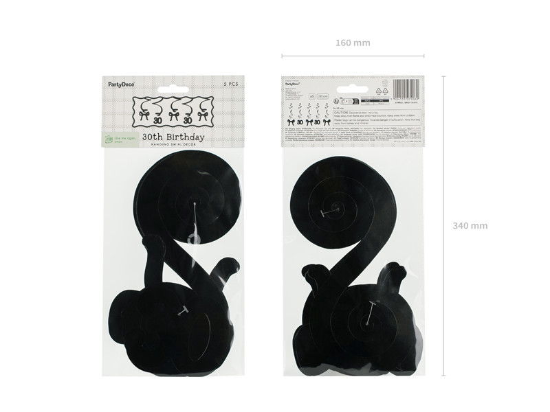 Sorte dekorationsswirls til 30-års fest med tallet 30 og elegante sløjfer – perfekt til en stilren og festlig dekoration.