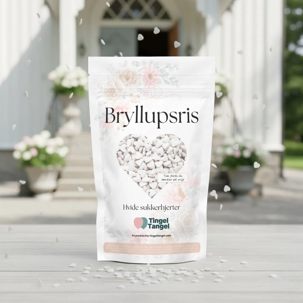 En pakke bryllupsris indeholder ca. 500 gram hvide sukkerhjerter. Vi anbefaler at købe små poser og emballage, så I kan dele dem ud til gæsterne, der skal kaste riset på brudeparret.