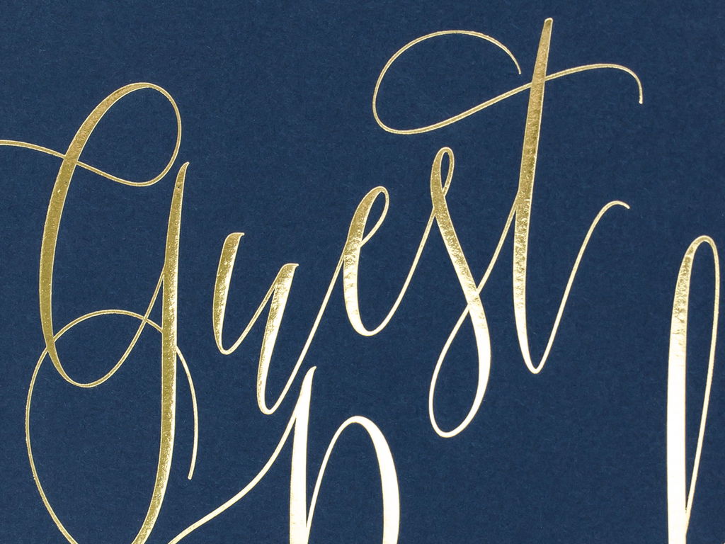 Elegant gæstebog i marineblå med gylden tekst – ideel til bryllupper, barnedåb eller jubilæer.