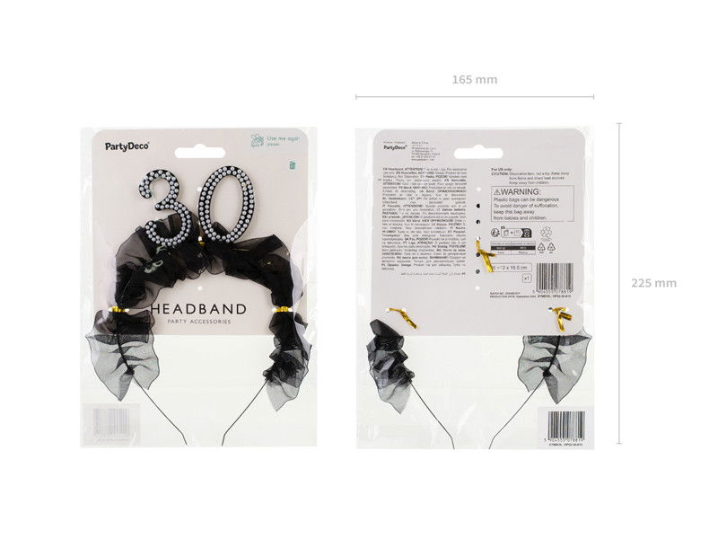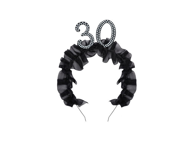 Sort hårbøjle med stof-flæse og tallet 30 dekoreret med elegante perler – perfekt til 30-års fødselsdag.
