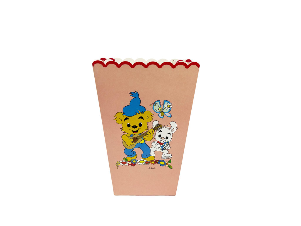 Farverige popcornbægre i pap med Bamse og venner. Kendte figurer fra Rune Andréassons klassiske tegneserie.