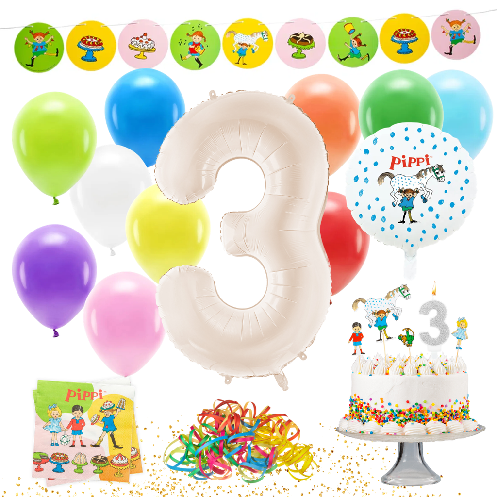 Suunnitteletko värikkäitä 3. syntymäpäiväjuhlia Peppi Pitkätossu-teemalla? Sitten tämä juhlapaketti on täydellinen ratkaisu! Kaikella ilmapalloista ja serpentiineista kakkukynttilöihin ja koristeisiin on helppo luoda leikkisä ja juhlava tunnelma. Pakollinen kaikille pienille Peppi-faneille!