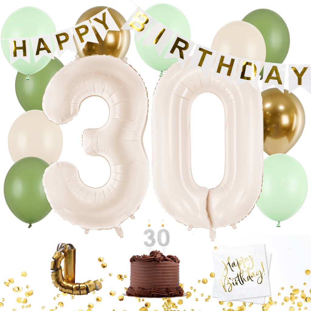 Juhli 30-vuotissyntymäpäivää tyylikkäästi tällä täydellisellä sisustussarjalla! Vihreän, beigen ja kultaisen tyylikkään yhdistelmän avulla saat juhlavan ja harmonisen sisustuksen, joka sopii täydellisesti niin suuriin kuin pieniin juhliin.
