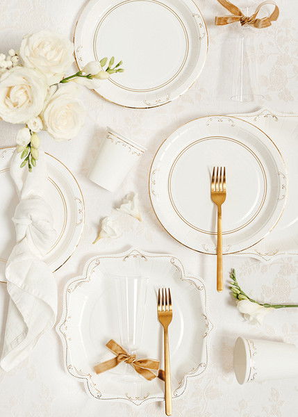 Eleganta pappmuggar i vitt med guldornament – snygga till festdukning och firande.